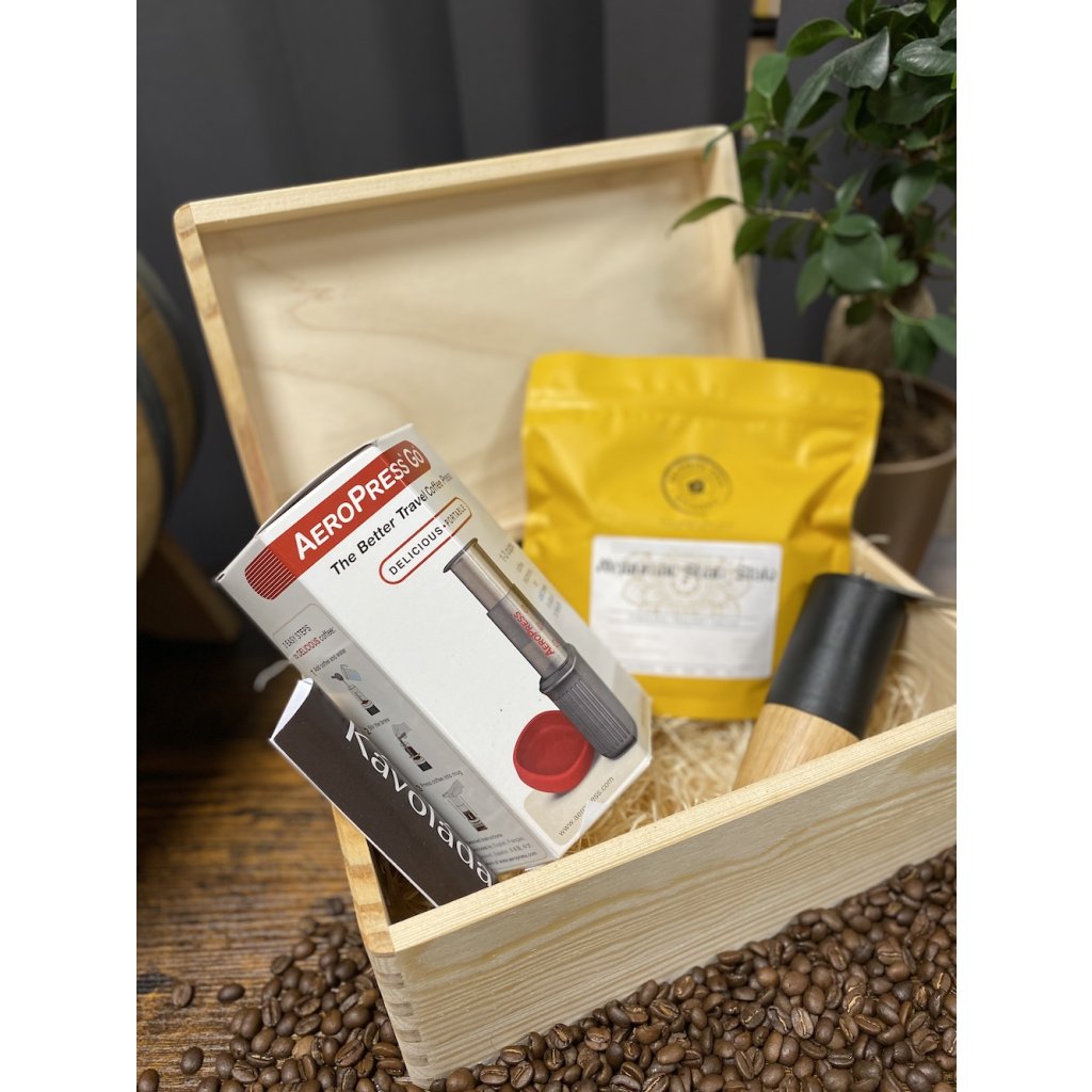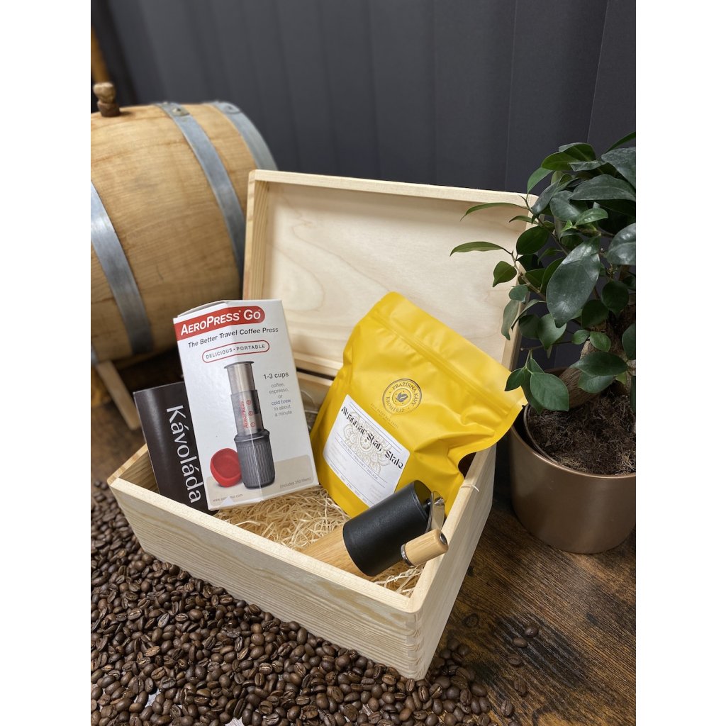 Jak už název napovídá, tato truhla je určena pro všechny cestovatele a objevitele. Spolu s praktickým a čím dál tím oblíbenějším aeropressem GO zde naleznete i malý mlýnek, příjemnou kávu z Barmy a unikátní kávoladu, při jejíž výrobě byla místo kakaových bobů použita naše káva Cuba Serrano Lavado. Ideální výbava na cesty!
