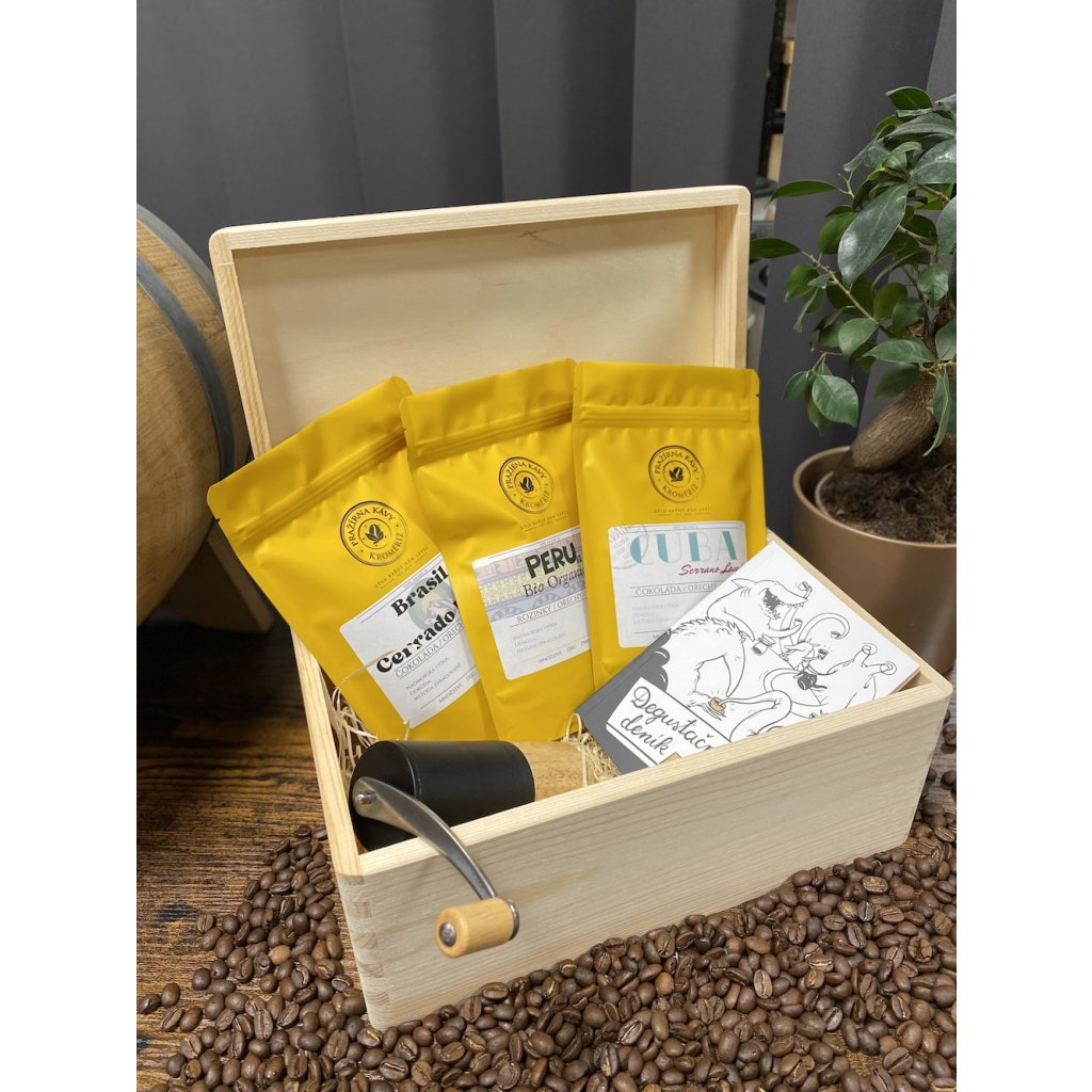 V naší pražírně jsme pro Vás připravili hned několik tematických dárkových sad, které jistě potěší nejedno správného kávomila. Všechny sady jsou zabaleny do praktické dřevěné truhly, která bude skvěle sloužit ještě dlouho poté, co už bude všechna káva vypita.