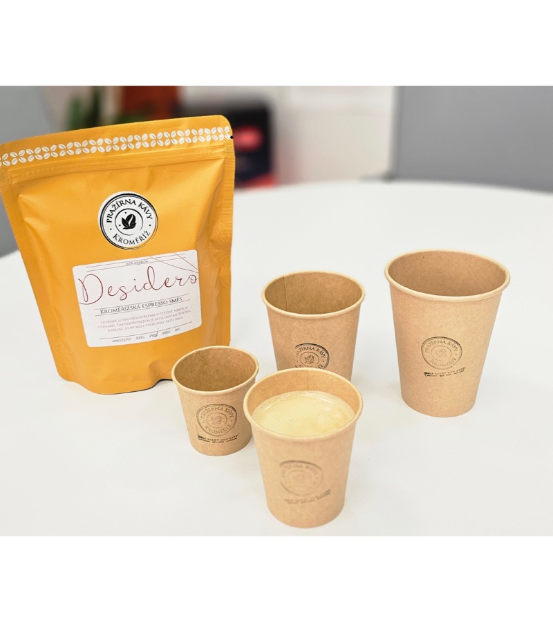 Stylové papírové kelímky s logem Kroměřížské pražírny jsou ideální volbou pro podávání kávy s sebou. Jsou vyrobené z kvalitního papíru, který je pevný, odolný a příjemný na držení. Díky modernímu designu se skvěle hodí pro kavárny, catering i firemní akce. Kelímky nabízíme samostatně, bez víčka.